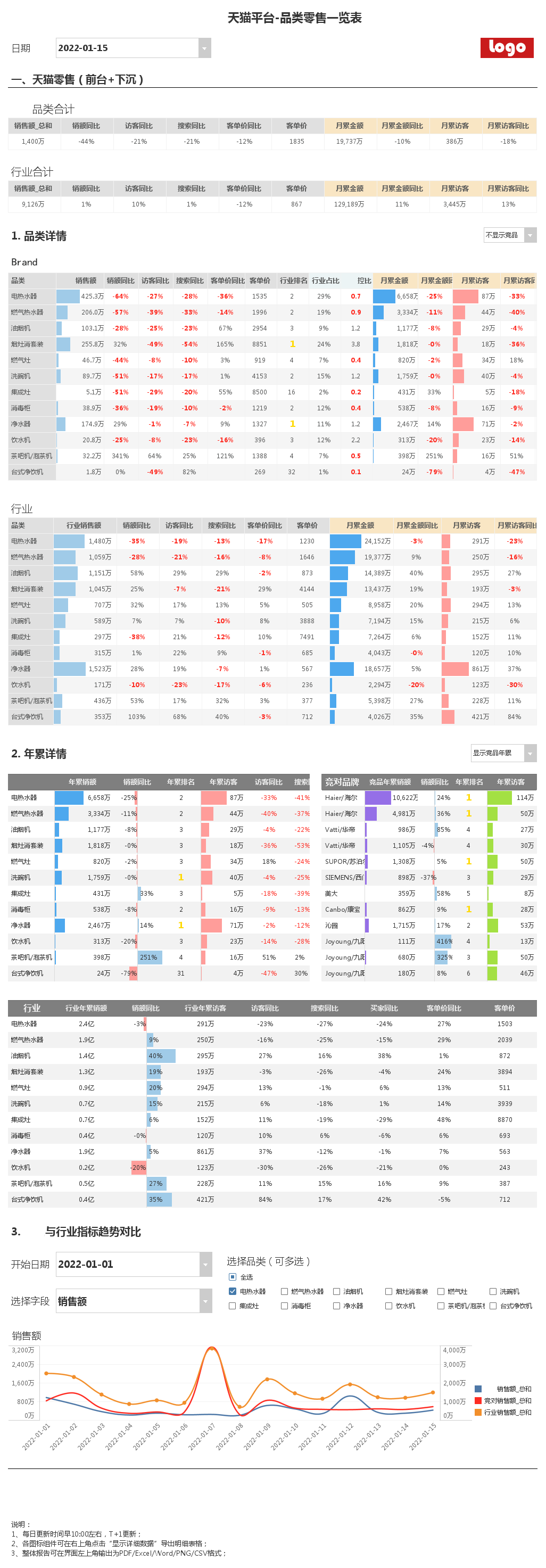 下方图片是我早期在某电商部门担任数据分析岗位时的看板作品,数据已做脱敏处理,无实际意义,这里只展示看板结构和样式。看板分析从整体对比行业、下钻单品类、对比竞品、年累分析、同比分析、趋势分析等多个视角展开,基本都是图表形式展现,虽然总说表不如图,但是表格所展现的信息更加明了,能展示更多的维度。如果改成图表数量太多,反而眼花难以突出重点,而且在表格中通过条件格式加持,可视化效果并不比图表弱。